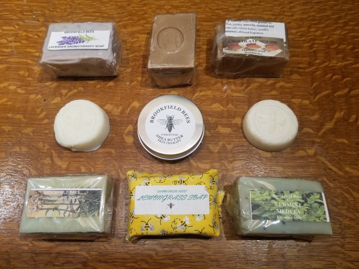 Brookfield Bees had a superb honey harvest this year as well as a good maple syrup season in the spring. Unfortunately, it has been a terrible year for apples so we will have no cider for sale. There will be plenty of candles, soap and shea butter.
